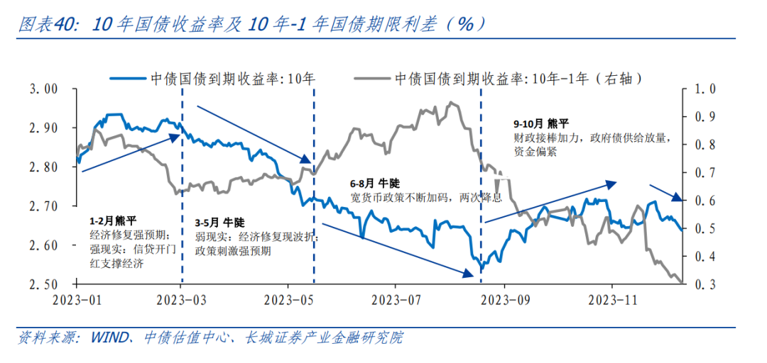 2023年,债市整体表现较强。国债收益率大致呈N型走势,经历两轮牛熊切换,主要是基本面现实与预期的多次调整。1-2月经济修复预期较强叠加信贷开门红支持“强现实”,10年国债收益率上行至2.9%以上。3月-8月国债收益率曲线陡峭化下移,主要是宽货币政策的不断加码,市场资金较松,叠加经济基本面的波折修复、高息信用债、RMBS等资产荒,8月21日10年国债收益率最低降至2.54%,创2020年5月以来低点。9月以来财政接棒继续发力,10月政府债供给放量冲击流动性,而房地产市场仍在深度调整,体现经济内生动力不足,债市再次平坦化上行。11月以来资金面偏紧仍是债市的一个关键制约,经济基本面暂无超预期走强,收益率曲线平坦化趋势依然未结束。